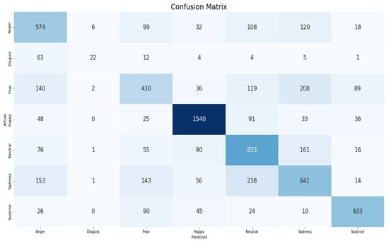 Figure 8 below allows visualization of the performance metrics of the proposed method in seven emotional classes in a comparison of “actual” and “predicted” sets. Based on the numbers represented in Figure 8, we can analyze the values of TP, FP, TN and FN.
