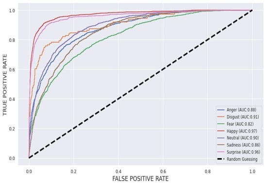 The ROC curve shows the performance of the classification model at all classification thresholds by plotting the TPR and FPR parameters. Plots of the four results (TP, FN, FP, and TN) in the ROC space are shown in the figure. Evidently, the result of the real Happy class shows the highest predictive accuracy among other emotional classes. As compared to the ROC curve analysis, based on Table 5 the Happy, Surprise, and Disgust emotion classes are classified as perfect with a range of 97%, 96%, and 91%, respectively. This indicates that the facial expression recognition of our proposed model is more uniform than that of the other emotional classes. The other emotions, such as the Neutral, Anger, and Sadness classes, were comparatively low in their range, reaching 90%, 88%, and 86%, respectively.