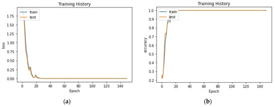 Loss (a) and accuracy (b) of proposed model in training and testing history of 150 epochs.