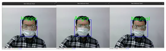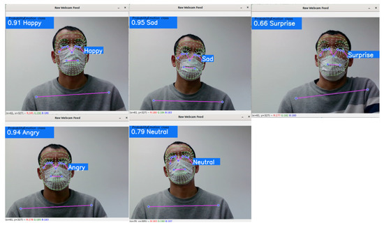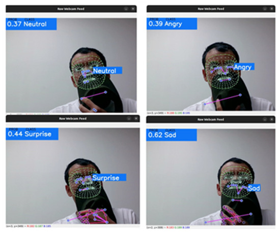 The recognition percentage of the emotional class and emotional class name is shown in the top left corner of the web camera and on the right side of the face. Figure 12 depicts the model’s performance in the real-time emotion analysis. Captures were taken for five emotional classes when the model reached its best detection percentage. Results indicate that, in real-time, the emotion analysis model achieved relatively higher percentages when landmark contours vary significantly.