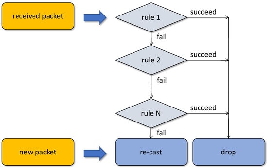 TARP is driven by a chain of rules illustrated in Figure 1. The rules execute in sequence, and the first one that succeeds breaks the processing resulting in the packet being abandoned. Their philosophy is to capitalize on the above assumptions and observations in the following way: