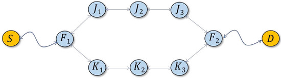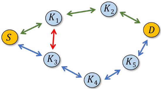 Figure 3 illustrates the operation SPD in collaboration with DD. If , then the exchange between S and D will be sustained through nodes and . Although is overhearing the packets transmitted by S and retransmitted by , it will find that the best path passing through it amounts to four hops, while the current shortest path length indicated in the field of those packets is three hops. If A is set to 1, the path leading through , , and will become active. In particular, D will be receiving packets both from and , rejecting those arriving from as duplicates. If the shorter path fails (a packet that should arrive from does not materialize at D), its would-be duplicate reaching D from will not be rejected, so the secondary path will take over seamlessly.