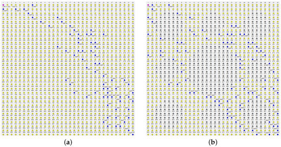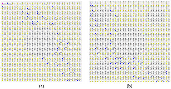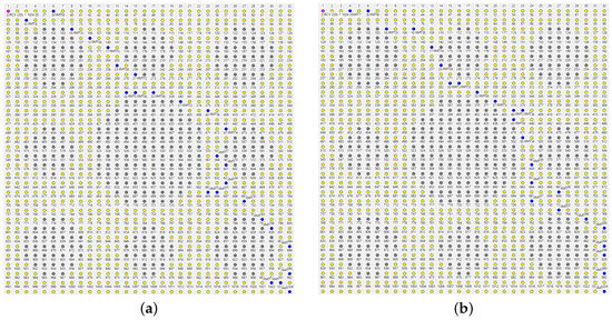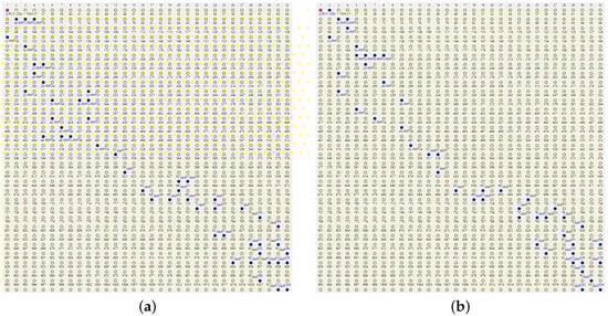 Paths for and (both within the same beacon interval). (a) Healthy network; (b) nine holes.