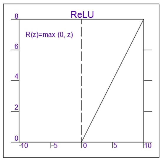 The feature extraction in DL is a nonlinear process and requires the application of nonlinear functions called the activation function. In a neural network, the activation layer uses an activation function (nonlinear) to navigate how the weighted sum of the input transforms from nodes to output. In this study, Rectified Linear Activation (ReLu) function (Figure 4) is used for all the CNN models, as shown in Equation (1). ReLu is a linear function that provides output only if the input is positive; otherwise, the output is zero meaning the neuron is deactivated. This provides advantages to computational efficiency as not all the neurons are activated in one instance.