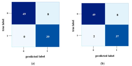 After analyzing the models with evaluation metrics, confusion matrix evaluation was performed based on the true label vs. prediction label of crack and spalling to determine which CNN classifier performs better on defects identification. Figure 6 portrays the confusion matrix for InceptionV3 and Xception models. For all the confusion matrix diagrams, the x-axis and y-axis represented the true label and predicted label, where “0” denotes the crack, and “1” refers to “spalling”. As mentioned earlier, the InceptonV3 and Xception model has the best performance with optimizer SGD and a learning rate of 0.001. Therefore, this study illustrated the confusion matrix graphs only for those conditions. Figure 6a,b illustrate the true and false prediction of defects by the InceptionV3 and Xception model, respectively, for a learning rate of 0.001 and optimizer SGD. The graphs show that crack prediction with both InceptionV3 and Xception models predicted forty-nine images correctly while making eight false predictions. In the case of spalling detection, InceptionV3 predicted all the spalling cases correctly, whereas Xception falsely identified two. From the explanation above, it is clear that the InceptionV3 model has superiority over the Xception model.