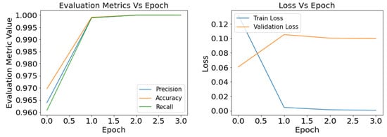 As the loss function helps the model reduce the difference between the true value and prediction value for tuning the hyper-parameters, it is essential to track the training loss and validation loss over the training period. Figure 7, Figure 8 and Figure 9 present the graphical understanding of the InceptionV3 model’s performance over the epochs for three learning rates 0.0001, 0.001, and 0.1. From the graphs, it is prominent that IncpetionV3 models have the least amount of loss with a learning rate of 0.001. Moreover, the trained model obtained sharp training accuracy, precision, and recall close to 100%.