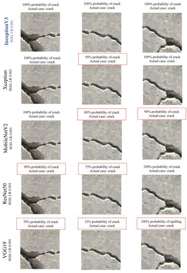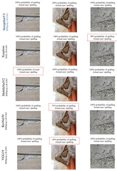 Figure 10 and Figure 11 demonstrate some sample results of defects identification of cracks and spalling for all the CNN classifiers. The image’s first sentence describes the prediction result of the defects, and the second line shows the label of defects type. Figure 10 indicates that InceptionV3 predicted most of the cracks with 100% accuracy. On the other hand, some crack images have an accuracy of around 90% and predicted very few crack images with spalling. Moreover, the VGG19 model has the least accuracy in crack prediction and even has some false predictions. Figure 11 shows that similar to crack prediction, the InceptionV3 model also performed best for spalling detection and VGG19 has the least accuracy. In both figures, the red box indicates the prediction inaccuracy. All the probability percentages for each damage case are the output results of developed CNN models.