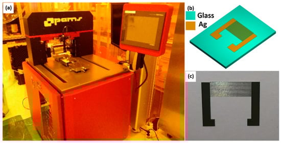 (a) Real photograph of reverse-offset printing system, (b) CAD design, and (c) real photograph of the Ag IDTs printed on glass.