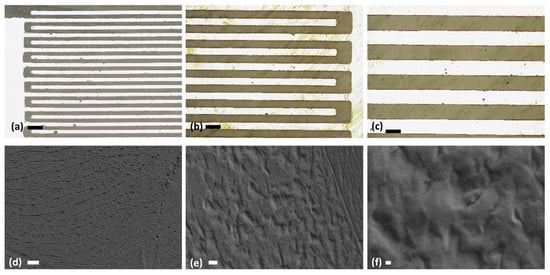 (a–c) Microscopic images of the reverse-offset printed IDTs after sintering, showing the dimensions of the IDTs fingers width and gaps, [scale bar- a: 200 µm, b: 100 µm, c: 50 µm] (d–f) SEM images of the sucrose film at different magnifications. Scale bars ((d): 10 µm, (e): 1 µm, (f): 200 nm).