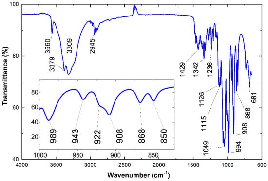 The FTIR spectra of sucrose. Inset shows the zoomed-in peaks in the region (650–1100 cm−1).