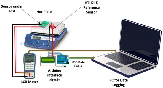 The fabricated temperature sensor was tested for its electrical response towards temperature changes in a controlled temperature environment. The inhouse built characterization setup can be seen in Figure 6. The measurement setup consists of a hotplate to control the temperature, sensor under test, HTU21D reference sensor, LCR meter to obtain and display the electrical signals from the sensor being tested, Arduino interface circuit with LCD to display the real time readings of the temperature on the hotplate surface being recorded by the HTU21D reference sensor, USB data cables and a laptop for automatic data logging from the Arduino circuit and LCR meter.