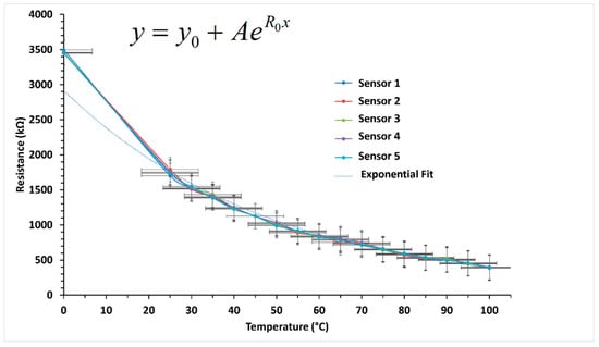 Figure 7 shows the trend in response of the sensors results for five similarly fabricated sensors. As the temperature increases, the overall resistance of the sensor decreases according to the above equation. By using the Boltzmann second order curve fitting equations, R2 value ≥ 0.99 was achieved. This shows the possibility of easy conversion of sensor response to temperature in °C with quite high accuracy by solving the generated equation.
