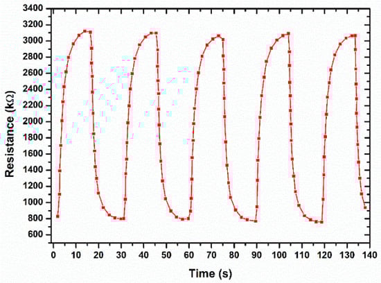 The fabricated temperature sensor was subjected to five consecutive heating and cooling cycles to calculate the response and recovery time of our temperature sensor. The results have been plotted in Figure 8. The response time is the time taken by the sensor to achieve the value from 10% to 90% of the maximum value and the recovery time is the time taken to achieve the value from 90% to 10% of the maximum value. The response and recovery time values are average of the values taken from all the heating and cooling cycles. It can be observed that the response time of the temperature sensor is approximately 4 s, and the recovery time is nearly 6 s. The sensor output response shows quick response and recovery times which are characteristics of a good performance.