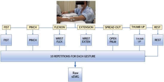 The procedure involved a one-time sampling of surface electromyography from patients in a controlled environment to minimize possible biases and monitor participant conditions. In the research design (Figure 1), patients in moderate or stable condition repetitively performed the following hand gestures 10 times each at the same interval from the idle hand posture: fist, pinch, wrist flexion, wrist extension, finger spread, and thumb up. Those clinically relevant gestures represent the basic components of ADLs which would be simultaneously and gradually introduced during early-stage rehabilitation [,]. Such movements are classified as repetitive fine hand training (index finger and thumb movements) and strength exercises (muscle coactivation for multifaceted motor control such as grip).