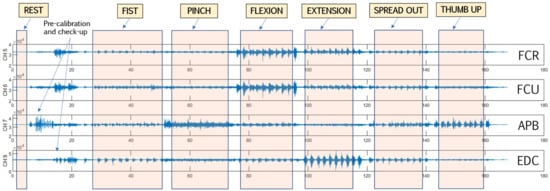 Representative four-channel sEMG data labeling and segmentation. FCR: flexor carpi radialis; FCU: flexor carpi ulnaris; APB: abductor pollicis brevis (thenar area); EDC: extensor digitorum communis.