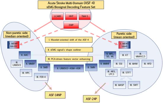 Considering the peculiarity of the myoelectric signature of post-stroke patients, we defined a diagram (Figure 3) for the initial selection of features that should reflect the specific movements of the hand and forearm: wavelet-oriented value shift of the time-scale function (MEWP and MEWT), the sEMG signal’s shape outliner, feature vector weight enhancing for supervised learning, and its adaptive approximation [].