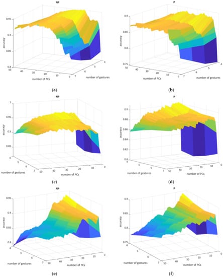 To investigate optimal performance settings, we applied principal component analysis (PCA) to tune concatenated feature vectors. PCA establishes dimensional reduction by removing similar linear subspace within the feature vector [], thereby highlighting the most relevant and distinct contents from the preprocessed sEMG signal that might serve as a feature selection approach. Indeed, PCA serves as a frontline method in noise signal processing [,] even for four-channel sEMG applications []. However, in our settings, due to obvious domination of time-domain single per-channel dimension features in the non-paretic subsets and multidimensional components in the frequency domain in the paretic subsets, we decided to set specific dimension reduction cutout settings. We, thus, used a one-dimensional investigation step for vector parameters from 1 to 50, where an integer value of 50 reflects the near-to-half complete feature vector structure number (ASF-14NP and ASF-24P).