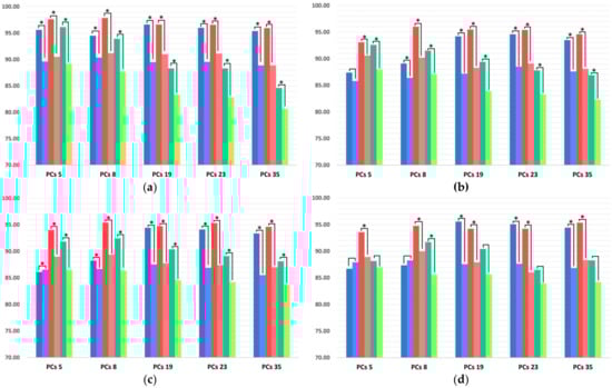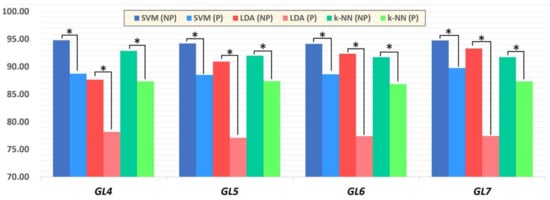 Total mean accuracy rates of GLs from four to seven using SVM, LDA, and k-NN, dependent on the application of PCA (* p < 0.05) on paretic (P19) and non-paretic (NP19) datasets: PCA-dependent GL4 (a), GL5 (b), GL6 (c), and GL7 (d) model. Legend options: dark blue (NP19) and blue (P19) bars are the Acc from SVM, red (NP19) and pale-red (P19) bars are the Acc from LDA, dark-green (NP19) and green (P19) bars are the Acc from k-NN. Asterisks between the paretic and non-paretic evaluations of the single classifier indicate statistical significance (* p < 0.05).