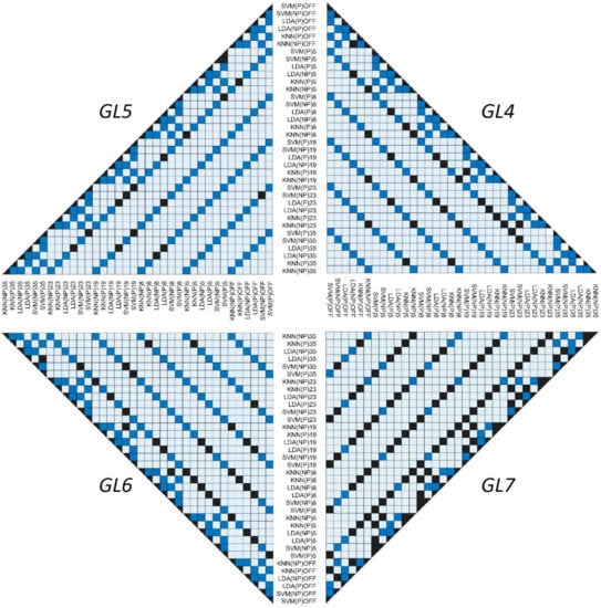 Furthermore, we summarized the cross-dimensional comparison of p-values between the classifiers (Figure 7). In this multi-model visualization, each square state indicates a specific event: dark blue demonstrates a p-value less than 0.05 (statistically valid relationship); black indicates a nonsignificant comparison between classifiers with a p-value of more than 0.05 (statistically invalid relationship); light blue reveals an absence of statistical relationships since a paired t-test evaluation was not performed due to logical inconsistency (invalid comparison).