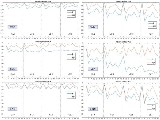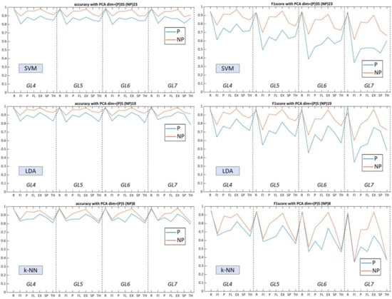 Here, we were able to visualize and conceptualize the PCA relationship with classification performance; for P19, SVM result metrics remained stable without the sharp accuracy spikes throughout the PCs, whereas the NP19 figure was heavily deformed when using small PCs numbers. LDA metrics had a similar shape but the P19 experienced an accuracy trend in which a smaller number of PCs had a greater recognition score for each GLs. For k-NN, figures turned out to be distorted in terms of accuracy where the optimal parameters were obtained from only low PCs values. As for harmonic mean or F1-score, in general, those metrics were correlated with accuracy, turned out to be sensitive in dimensional investigation, and had larger deviation parameters across GLs.