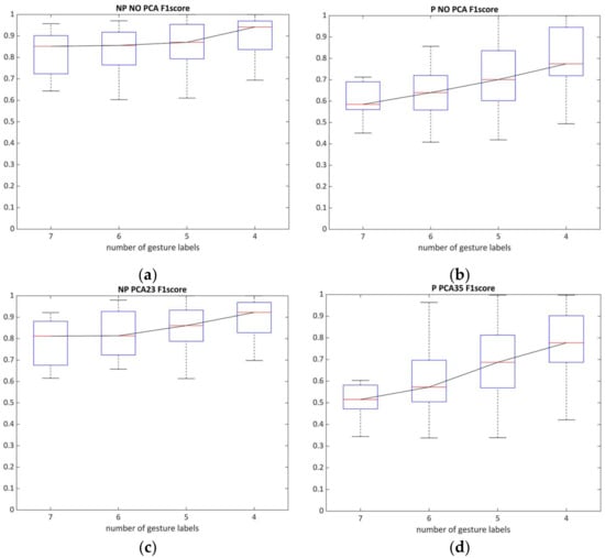 During testing of the difference between classifiers (p < 0.05), we discovered an interesting observation that, within each GL, the statistically viable pairs in both datasets had precisely specific patterns in spite of the model complexity and number of PCs (five, 19, and 23). Thus, additional insight related to paretic GL6 and GL7 combinations, in which significance between the groups was achieved only within a single inter-class of classifiers between the affected and non-affected sides, is required from future experiments on an expanded patient population. For this, we hypothesize that, for each stroke-oriented feature set, the classifier behavior has a specific pattern depending on dimensional reduction [,] which can be tuned toward the particular gesture of interest. Lastly, since PCA reduces computational effort and targets certain synergetic active myoelectrical patterns in certain applications, it was judged essential for real-time use.