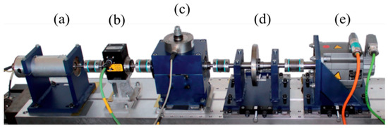 The Paderborn University (PU) dataset is provided by the Paderborn University Bearing Data Center [44,45]. The test ring of the PU dataset consists of several modules: an electric motor (a), a torque-measurement shaft (b), a rolling bearing test module (c), a flywheel (d), and a load motor (e); see Figure 2. There are three kinds of bearings in the PU dataset: (1) six undamaged bearings; (2) twelve artificially damaged bearings; and (3) fourteen bearings with real damages caused by accelerated lifetime tests. To show the performance of the proposed preprocessing method, we would like to use the data collected from real damaged bearings (including KA04, KA15, KA16, KA22, KA30, KB23, KB24, KB27, KI14, KI16, KI17, KI18, and KI22). Since KI04 was the same as KI14, we kept KI04 [44]. Here, the details of the used fault dataset are described as follows: the bearing rotating speed is 1500 rpm; the load is 0.7 Nm; the radial force is 1000 N; and the sampling rate is 64 kHz. Hence, there is a 13-class classification task.