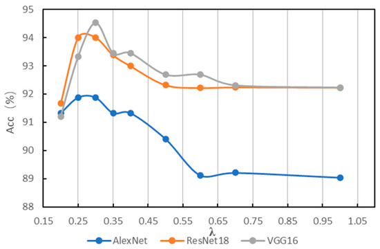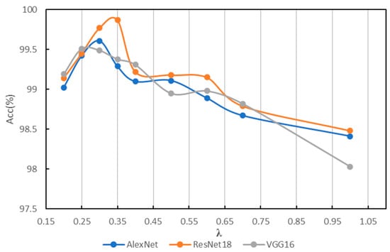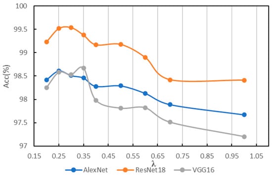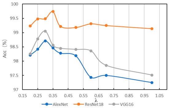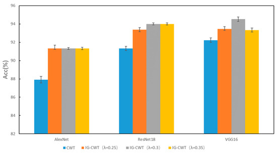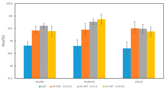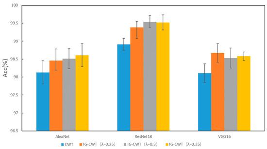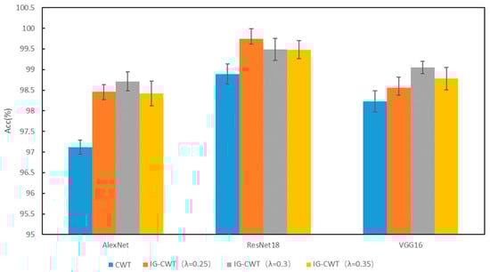 In order to find a suitable hyperparameter λ of IG-CWT for data preprocessing, different values of hyperparameter λ are tested using the accuracy of fault diagnosis with the three models mentioned above. The λ is set as 0.1, 0.2, …, 1.0, and we found that close frequency ranges are obtained with 0.8, 0.9, and 1.0, so only 1.0 is kept. Additionally, when λ = 0.1, the frequency range is 0–32 kHz. So, 0.1 is discarded. The results based on ResNet18 are shown in Table 1; the results show that different frequency ranges are obtained with different values of λ, which have influence on the accuracy of fault diagnosis. When λ = 0.3, ResNet18 can achieve fault diagnosis accuracy of 99.54, which is the best accuracy of different values of λ in our experiments. So, a λ = 0.35 and 0.25 is added for experiments. We conduct the same experiments with AlexNet and VGG16; the results of the three models are in Table 1. For reading convenience, the results are visualized in Figure 4. The results show that different models have different obvious performance in accuracy with different frequency ranges. Results show that AlexNet, ResNet18, and VGG16 achieve the best classification performance with λ = 0.25, 0.3, and 0.35, respectively, the best accuracies are in bold in Table 1. Figure 4 indicates that when λ = 0.35~0.25, models have the best performance in general. Additionally, when λ < 0.25, the reason for lower accuracy is that some unimportant frequency features are incorporated in the input time–frequency images. When λ > 0.35, the reason for lower accuracy is that some important frequency features are not incorporated in input images. Additionally, although there are three values of λ for the best accuracies, they are in a small scope of 0.25~0.35, and the frequency ranges for the best accuracy are similar, which are 0.2–16.8, 0.4–17.0, and 0.2–16.6. So, a suitable frequency range is needed for fault diagnosis, even though models may be different.