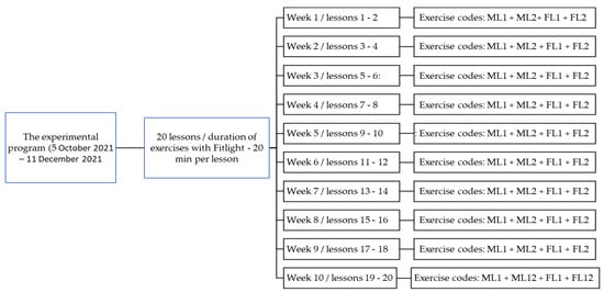 In order to assign the exercises to the lessons within the experimental period, we coded each exercise as follows: exercises for the development of reaction time in relation to the education of manual laterality received the ML code, being numbered ML1–ML12; exercises for the development of reaction time in relation to the education of foot laterality received the code FL, being numbered FL1–FL12. The sequence of these exercises for each lesson is presented in Figure 1.
