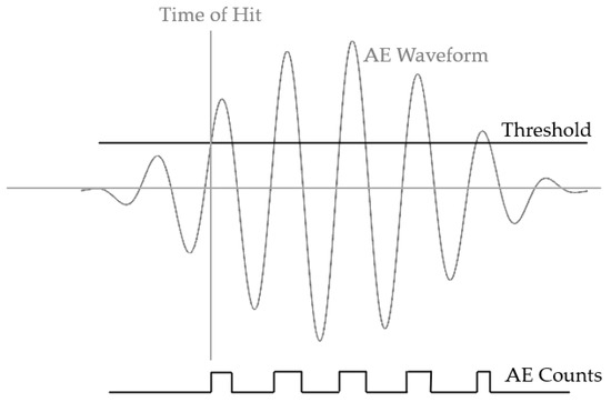 AE count has been studied since 1983. AE count is defined as the number of times that the AE waveform excurses over the pre-defined threshold [9] as shown in Figure 1, and AE count rate is the count per unit of time. Scala and Cousland [10] found that under their experimental regime, AE occurred only at the tops of load cycles. In addition, when the crack growth rate was higher, it was found that the AE count rate was higher. Based on the comparison of the count rate of aluminium 2024 and 2124, they concluded that the AE sources for these hits that occurred at the tops of load cycles were inclusion fractures. In their study, they pointed out that the AE activity varied significantly due to the inclusion size, so the count rate needed to be averaged to observe the linear relationship between the count rate and crack growth rate. The area of inclusion for Al2024 varied from 1 to 300 μm2 and the majority was within the 1–25 μm2 range on the plane normal to the rolling plane. The minimum crack growth rate in their study was 0.1 μm per load. Other studies have also verified the relationship between crack growth rate and the AE count rate/energy rate with stress intensity range [3,11]. However, it was also found that with a different R-ratio, the coefficients of this linear relationship were different even with similar crack growth rate [11]. The study of Gagar et al. [12] used the crack-closure based AE results to predict the length of the crack. However, this method was geometry-based and might be hard to be extended to general usage. Other studies used the acoustic emission entropy as the parameter in monitoring the damage progress [13,14].