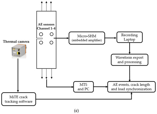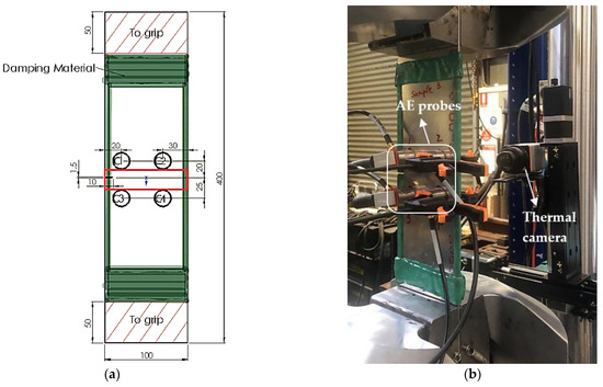 The experimental set-up is shown in Figure 2b, and a flow chart illustrating the experimental procedure is shown in Figure 2c. The face of the specimens facing the thermal camera was painted with high-emissivity black paint to aid inspection. The other face of the specimens was instrumented with an array of four AE sensors (denoted as C1 to C4) at the recording positions shown in Figure 2a. Proper grease couplant was applied between the specimen surface and the sensor surface, and the sensors were held against the specimen surface with pressure provided by lightweight clamps [9]. The specimen was applied with damping material around the edges to attenuate the noise from the grips and the reflective waves from the edges. The threshold of Micro-SHM was set to 44 dB, which is marginally above the determined noise level from acoustic recordings taken when the specimen is gripped in the tensile machine under loading.
