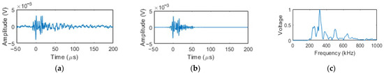 To study the AE waveform frequency feature, filtering, windowing, and deconvolution were applied to the waveforms collected. The waveforms were first passed through a digital 8th order Butterworth band-pass filter where only frequency responses between 200 and 1000 kHz were kept, corresponding to the operating range of AE sensors. Then the waveforms were time-gated using a Tukey (tapered cosine) window and then processed by fast Fourier transform (FFT). Finally, the magnitudes of FFT were deconvoluted in the frequency domain with respect to the sensor calibration chart provided by the manufacturer. After filtering, windowing, and deconvolution, the correct FFT dominant frequency of waveforms could be obtained. Example waveforms before and after processing with their FFT results are shown in Figure 3. The peak frequency of waveform in the FFT result was used in selecting waveforms.