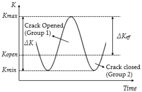 where is the stress intensity factor range, and and are the minimum and maximum stress intensity factors respectively; is the effective stress intensity factor range, and is the crack opening stress intensity factor.
