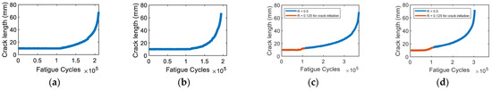 Crack growth curves: (a) Specimen A (R = 0.125); (b) Specimen B (R = 0.125); (c) Specimen C (R = 0.5); (d) Specimen D (R = 0.5).