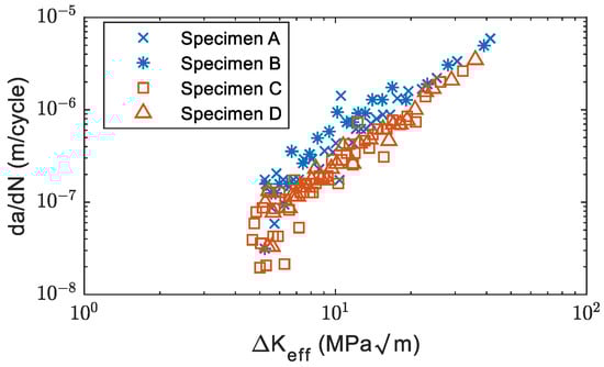 The crack propagation and crack growth rate curves of specimens obtained from the visual tracking system are shown in Figure 5a–d. As shown in Figure 5c,d, Specimens C and D were initially tested with R = 0.125 and then increased to R = 0.5 with a fixed maximum load at a crack length of around 15 mm. To reach a similar crack length, it took more fatigue cycles for Specimens C and D compared to Specimens A and B. Figure 6a–d shows the crack growth rate of four specimens. The crack growth rate versus the effective stress intensity factor is show in Figure 7. It was found that the effective stress intensity ranges at the end of Specimens A and B were slightly higher than Specimens C and D. The data in Figure 7 shows relatively good agreement with the data in the Damage Tolerance Handbook [33].