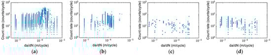 AE counts per cycle vs. crack growth rate: (a) Specimen A; (b) Specimen B; (c) Specimen C (after crack initiation); and (d) Specimen D (after crack initiation).