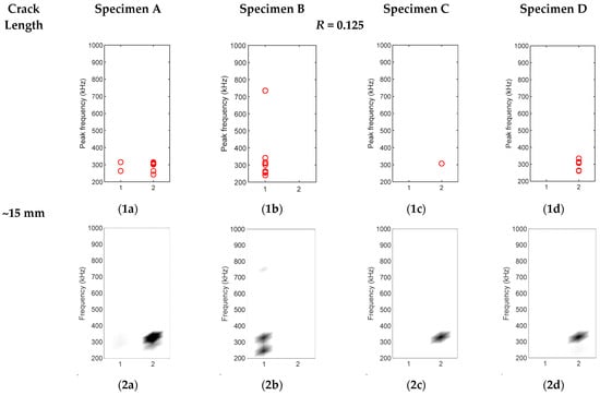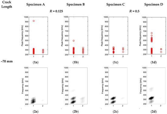 To characterise the crack closure source and crack opening source, hits collected during 0.1 Hz loading frequency were divided into two groups as described in Section 2.2.2. The groupings of hits for four specimens are shown in Figure 9, Figure 10 and Figure 11. The x-axis is the group number, and the y-axis is the peak FFT frequency of hit. The peak frequency of each waveform is represented as one circle in Figure 9, Figure 10 and Figure 11(1a–1d). The corresponding density diagrams for plots Figure 9, Figure 10 and Figure 11(1a–1d) were devised and plotted in Figure 9, Figure 10 and Figure 11(2a–2d), in which the darker colour represents the occurrence of a larger number of hits.