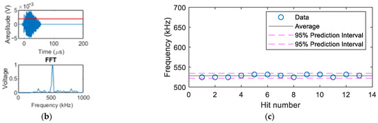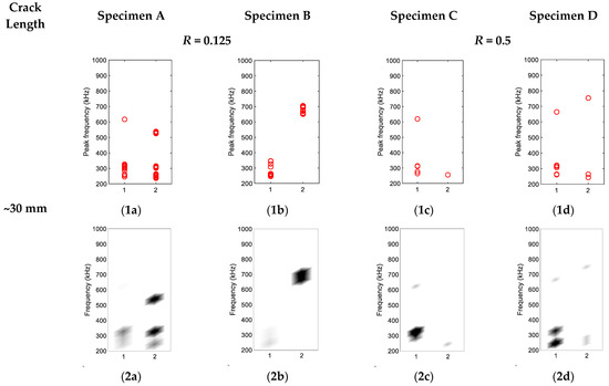 When the crack was 30 mm (see Figure 10), there were more high-frequency hits classified in Groups 2 for Specimens A and B. The reason for this was that the AE source caused by crack closure was intensified, resulting in contact of the crack surfaces when the crack surfaces closed during decreasing load. From Figure 13b and Figure 14b, the appearance of high-frequency content in the waveforms was also noticed. As shown in Figure 13c and Figure 14c, the dominant frequency of the AE source due to crack closure was between 500–700 kHz.