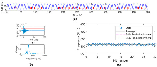 Specimen A when crack is 30 mm: (a) Hits during crack closure when the load was decreasing; (b) example waveform and its FFT; (c) FFT peak frequency of corresponding hits.