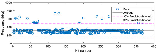To study the peak FFT frequency of waveforms for crack extension, the peak frequencies of hits for Specimens A, B, C, and D when the crack was open are plotted in Figure 15. Statistically, it was found that the average peak frequency of these hits was 320 kHz and that 95% of them had a peak frequency between the range of 152–487 kHz. This frequency range is similar to that seen by Bhuiyan and Giurgiutiu [5] where they found the dominant frequencies for crack extension AE sources of Al2024-T3 specimens were 100 kHz, 230 kHz, 450 kHz, and 550 kHz.
