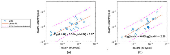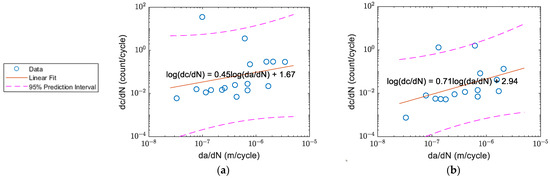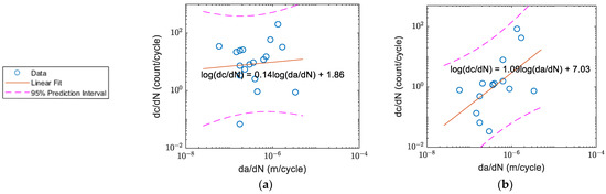 The correlation of count rate and crack growth of Specimens A–D before and after the waveform selection are shown in Figure 16, Figure 17, Figure 18 and Figure 19 respectively. The count rate versus crack growth rate for all specimens is shown in Figure 20. In order to obtain a reasonable plot of count rate versus crack growth rate, the count rate per cycle and crack growth rate needed to be averaged over a time interval. The area of the majority of the inclusion for Al2024 was within the 1–25 μm2 range [10]. To keep an increment of minimum 25 μm2 for the current 3 mm-thick specimens, the increment for crack growth should be at least μm (~0.01 mm or 1 × 10−8 m).
