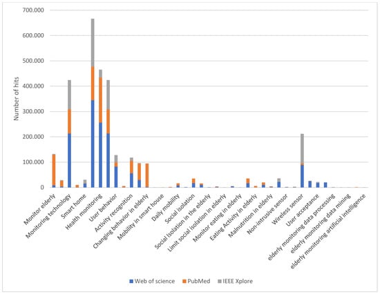 In our search, we tried to find articles, abstracts and websites with the keywords listed in Table 1. The keywords are used alone or combined using and/or operators. Due to the enormous number of articles and abstracts retrieved, it was decided to include only the articles published for the period 2010 to 2020 in Web of Science, PubMed and IEEE Xplore. Some websites describing projects or reports from governmental or international institutions were included when the published scientific literature did not provide adequate information on the subject. Taking into consideration the number of hits in the bibliographic database for each keyword, we can find the hotspots of research in this field and the aspects that are still rarely covered. As this review is not an exhaustive presentation of the scientific literature in the field of elderly monitoring systems, only a few representative research and development projects or products from academia or industry are presented.