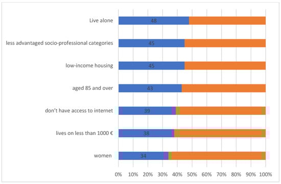 Furthermore, the French association “Petits Frères des Pauvres” released a report about the links between loneliness, isolation of the elderly, and the territories []. It indicates that loneliness is amplified in certain areas and particularly affects elderly over 85 (mainly women) who live alone, belong to less privileged socio-professional categories (with income below 1000€ per month), live in social housing, and have no access to internet. Figure 2 illustrates the percentage of people feeling loneliness for each category.