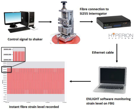Tension is considered the most damaging load case because of the relatively poor fracture resistance of optical fibres under the crack opening (mode I) condition. In the present stduy, tensile cyclic loads are applied to FBGs in coated optical fibres via a custom-designed fibre fatigue test assembly, as shown in Figure 1. Sinusoidal cyclic loading was applied using a high-capacity electrodynamic shaker (TIRA GmbH S50350, Schalkau, Germany) driven by a vibration controller. The amplitude and frequency of the assembly are adjustable and can achieve a maximum strain and frequency of 36,000 µε and 100 Hz, respectively. The induced strain on the FBG was continuously recorded using an industrial-grade optical sensing interrogator (Micron Optics Si255, Atlanta, GA, USA). This interrogator featured a dynamic strain range of approximately 130,000 µε across a wavelength range from 1460–1620 nm. The unstrained Bragg wavelength for the FBGs tested was between 1530–1550 nm, and the anticipated strain under peak loading was confirmed to be well within the interrogator sensing range. The details of the assembly design and the system optimisation were previously reported [37].