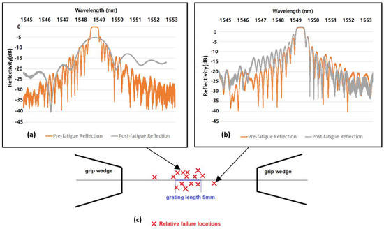 The optical reflection and transmission characteristics of FBG sensors are mainly determined by grating length, index contrast, and grating pitch, which contribute to determining their spectral profile [59]. A 1 pm high-resolution laser (Yenista TS100, EXFO, Quebec, QC, Canada) combined with a component tester (Yenista, CT400, EXFO, Quebec, QC, Canada) characterised the reflection and transmission spectra of the FBGs before and after their fatigue testing. These scans allow the critical features in the FBG spectra to be characterised, such as Bragg (centre) wavelength, side lobes, and reflectivity. The high optical power and wavelength resolution also allow accurate determination of any changes to the post-fatigue spectral profile, indicating material or coating damage. If fibres fail at the Bragg grating region during fatigue testing, the post-fatigue reflection profile will exhibit a drastic change due to damage to the grating. The pre- and post-fatigue reflection spectrum comparison and the post-failure microscopic analysis both contributed to the performance assessment of the trans-jacket FBGs.