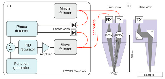 In our system, we used the ECOPS-based Toptica TERAFLASH platform with a reflection THz head (Figure 1) [17]. The platform uses two 25 mW fiber-based femtosecond lasers (maser and slave) centered at 1560 nm. Their repetition rate is 80 MHz, and the pulse width is typically 80 fs. The repetition rate of each laser is measured by the photodiode and is tuned by adjusting the temperature of the fiber oscillator. The slave laser is stabilized to the clock of the master laser by the phase-locked loop. The 1600 Hz periodic modulation is imposed on the slave laser by the function generator.