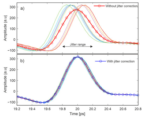 Ten waveforms and their averaging (line with circles) without (a) and with (b) jitter correction.