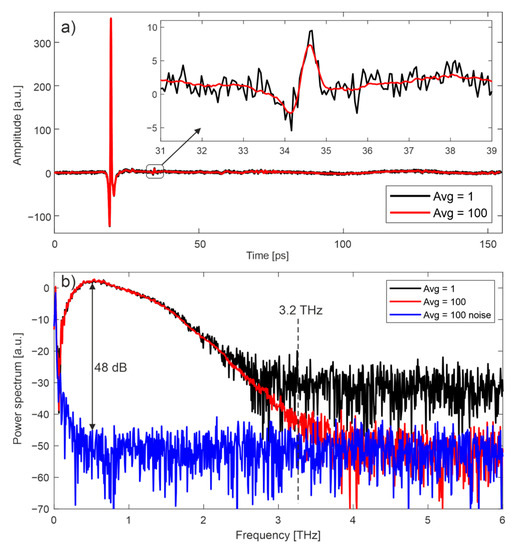 Figure 3 presents terahertz waveforms and their spectra measured with jitter correction for two averaging values considered in this work: 1 (no averaging) and 100. The radiation was reflected from a gold mirror placed in the focus of the THz beam. Each waveform was approximately 154 ps long and its main pulse lasted around 0.35 ps (FWHM). The inset in Figure 3a shows the influence of averaging on the smoothing of the signal. The dynamic range [21] and the spectrum range of a single waveform were approximately 25 dB and 2.2 THz, respectively, and increased to 48 dB and 3.2 THz, respectively, when 100 waveforms were averaged.