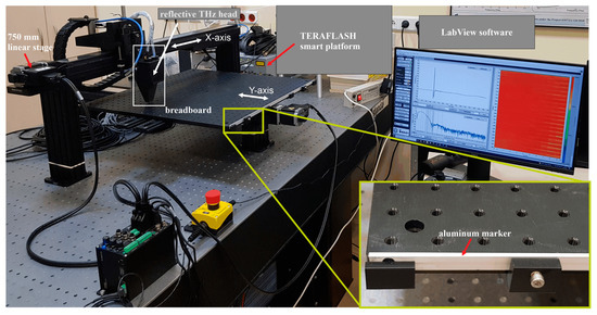The X-axis stage had the optical head mounted, while the Y-axis stage was equipped with the aluminum breadboard (Thorlabs MB6060/M) with dimensions of 600 × 600 mm. The breadboard has M6 mounting holes every 25 mm. The system can scan a few centimeter-thick samples with size up to 500 × 500 mm. The slow X-axis stage moves the head over the sample point-by-point, while the fast Y-axis stage moves the sample under the THz head point-by-point or line-by-line. This approach minimizes the impact of continuous acceleration and deacceleration of the head, which could adversely affect its operation. The step size of the motor in the X-axis can be freely set with a resolution up to 2 µm.