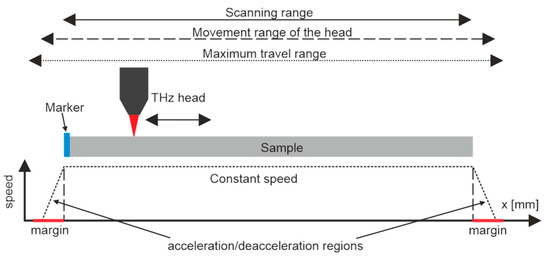 The challenge in fast continuous linear scanning is synchronization, which can be reduced to the problem of assigning a specific TDS waveform to the proper fragment (point) of the scanned sample. In the considered TeraFlash platform, successive TDS waveforms were recorded with a fixed interval of time. However, it was difficult to determine the beginning and end of a series of waveforms. This problem was solved by placing a 3-mm-wide aluminum flat bar on the edge of the breadboard, which acted as a marker (Figure 5, inset in Figure 4). When scanning, it was always slightly above the sample, so that its waveforms could be easily distinguished from other waveforms related to the sample. The collected series of waveforms were shifted so that the waveform from the synchronization marker provided a clear time stamp. The movement of the THz head was performed in a range wider than the size of the scanned sample. The margins were set so that the THz head could achieve a constant speed during the scanning (Figure 5).