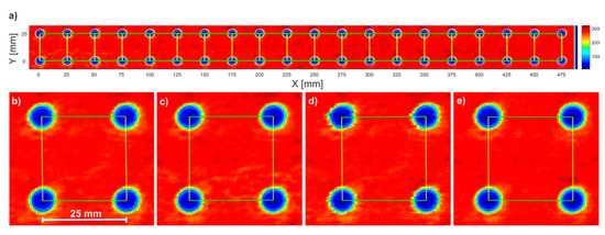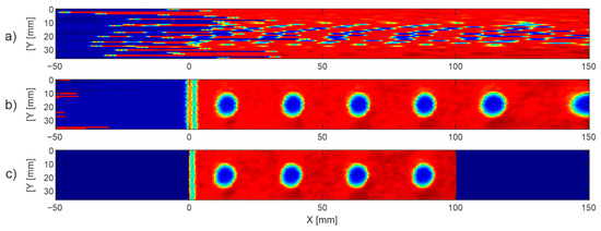 Figure 6 shows the line shifting algorithm for the 40 × 100 mm scanning range of the plate with M6 holes. At the first step, we uniformly scanned the region with 50 mm margins on both sides (movement range of the head), which resulted in the randomly shifted lines (presented as C-scan) shown in Figure 6a. The algorithm then found the unique marker signal in each line and shifted the lines so that their marker signals’ centers matched point 0; see Figure 6b. The first four holes (blue spots) were uniform, while the two last holes were stretched because they were in the margin region, where the speed was decreasing. Finally, the margin regions were removed to show only the image of the sample in the given scanning range (Figure 6c).